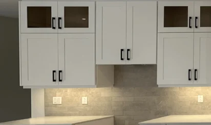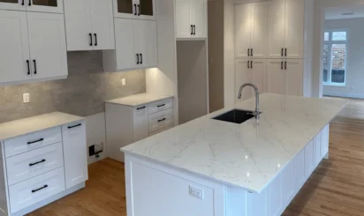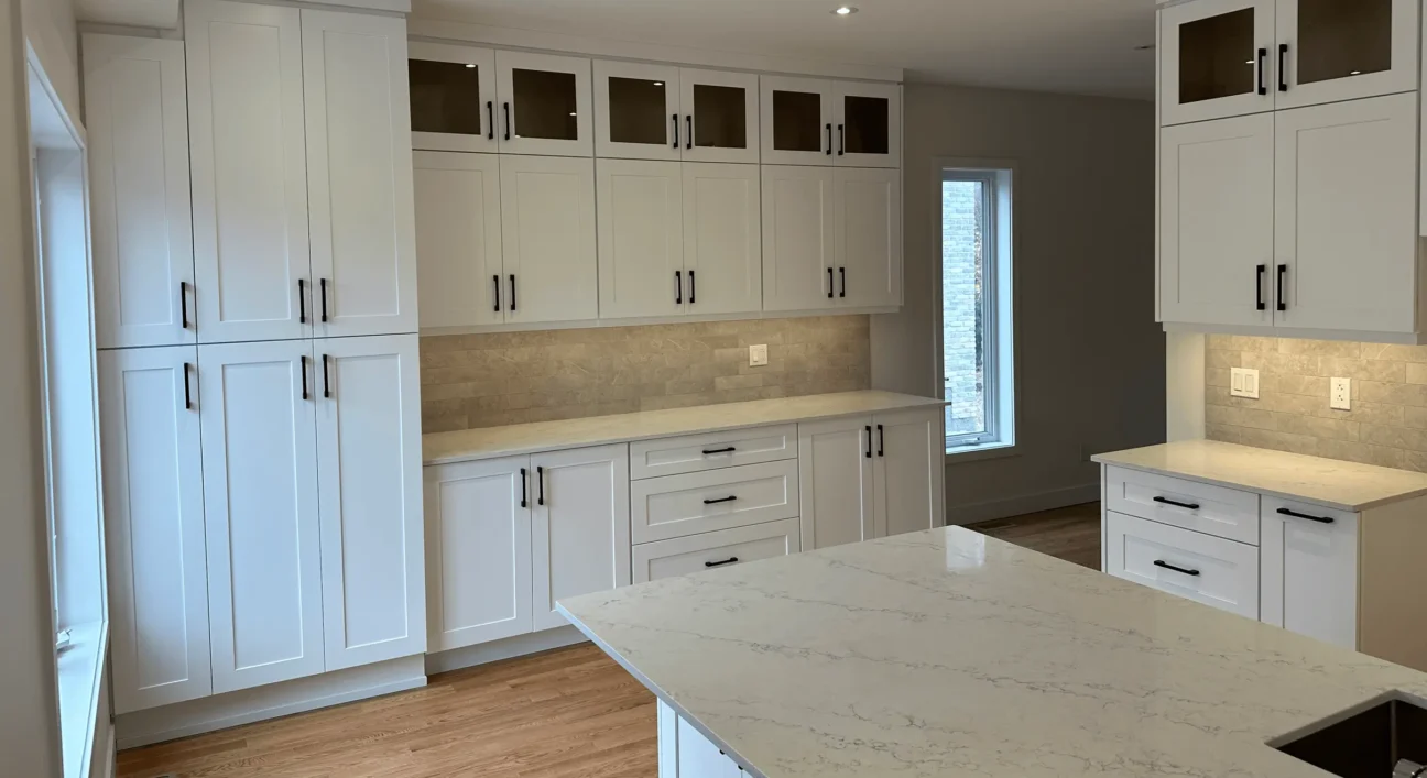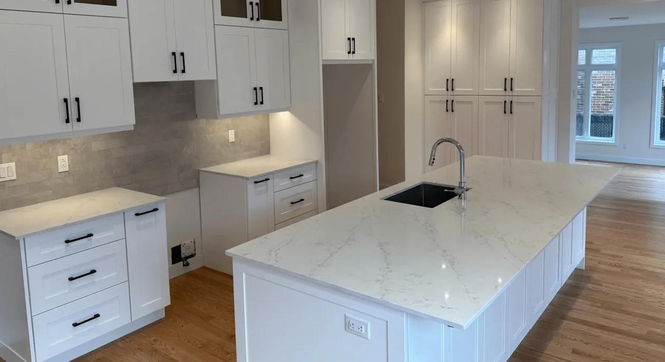 Cuisine contemporaine alliant blanc pur et accents noirs pour un style moderne et chaleureux. Les armoires shaker sur mesure et l’îlot en quartz reflètent le savoir-faire Dilamco : design, qualité et durabilité.